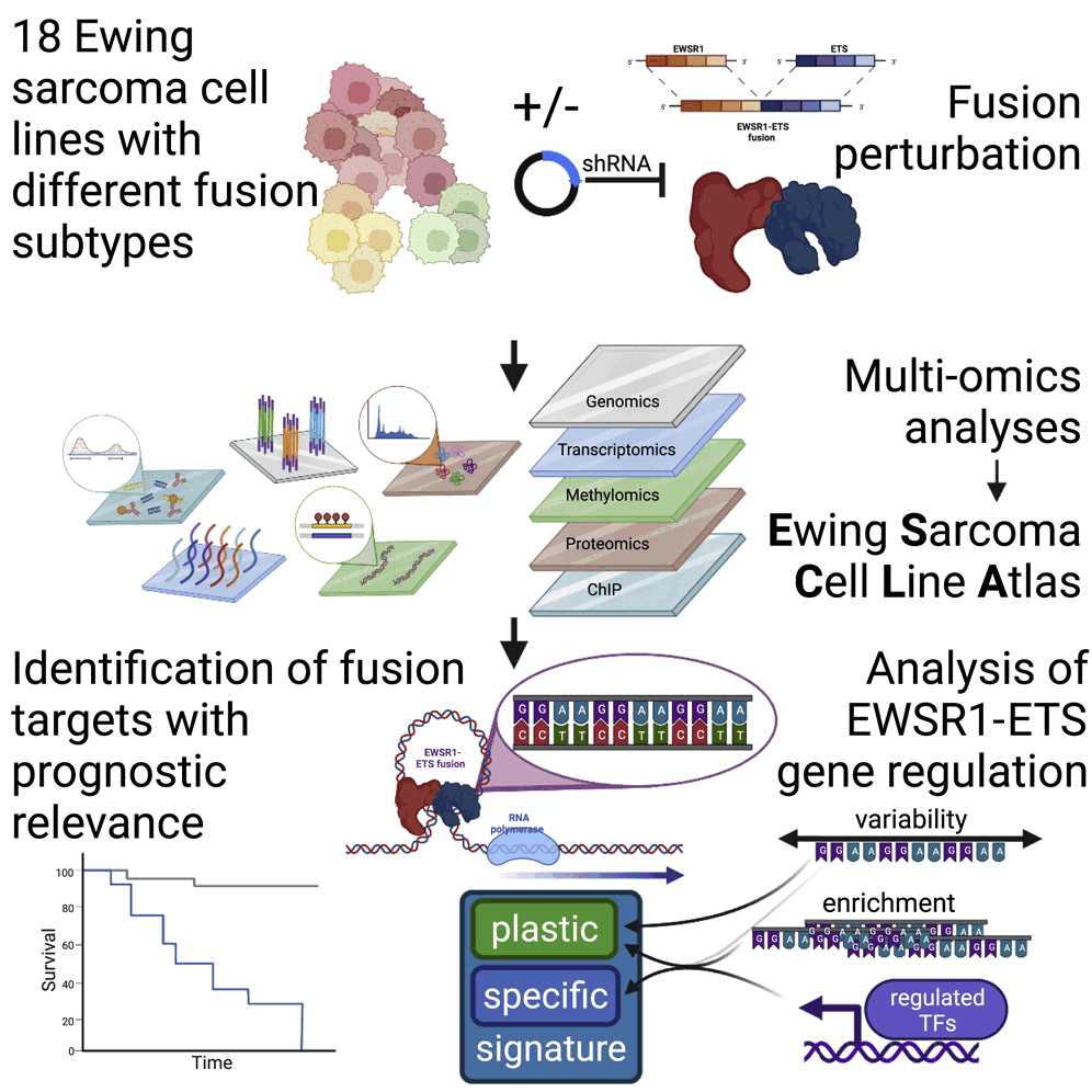 Systematic multi-omics cell line profiling uncovers principles of Ewing sarcoma fusion oncogene-mediated gene regulationEwing sarcoma (EwS) is characterized by