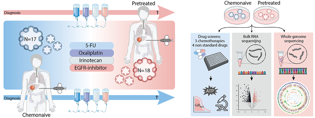 PDOs from pretreated patients exhibited significantly higher tumor mutational load, more structural variants, and more deep deletions in driver genes at common fragile sites. Chemotherapy-related mutational signatures SBS17A, SBS17B and DBS5 were observed in PDOs from pretreated patients and the magnitude of these signatures correlated with previous exposure to 5-FU and oxaliplatin. PDOs derived from oxaliplatin-resistant patients captured the acquired resistance and did not show specific genomic alterations. PDOs derived from PDOs from oxaliplatin-resistant patients showed upregulation of ZNF300 and TGM2, along with enrichment of genes in the Hedgehog signaling pathway. In contrast, acquired resistance to 5-FU and irinotecan was only captured partially in PDOs. Acquired intrinsic resistance to irinotecan in pretreated PDOs correlated with specific genomic alterations: SBS17A and deep deletions in genes located at common fragile sites. These deletions were associated with a distinct gene expression profile with enrichment of BIRC3 and FBXO44. We identified 103 genes whose expression levels correlated with chemotherapy resistance in PDO drug screens. While oxaliplatin resistance correlated with gene expression in both primary and acquired resistant PDOs, correlations for SN-38 and 5-FU resistance were only observed in acquired resistant PDOs.