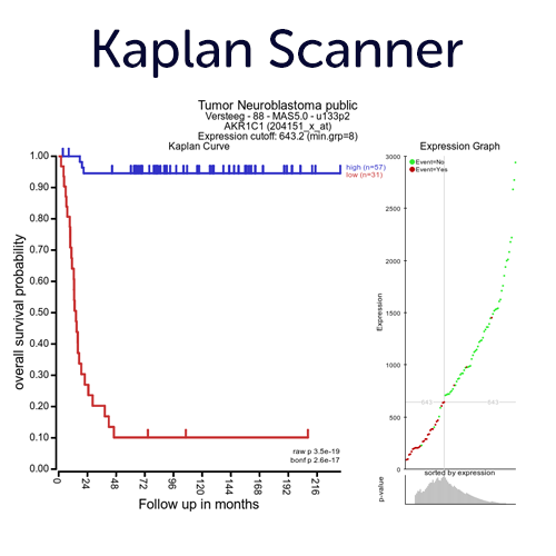 Use our KaplanScanner tool to find the optimal 2 group segregation (based on the expression of gene) on the logrank p-value for Kaplan Meier curves with the best survival difference. Next to the KaplanScan option, the R2platform also provides other separation options to assess segregation from gene expression, such as median, quartiles, of the average expression of a gene.